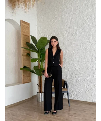 Myra Pileli Gold Düğme Palazzo Pantolon - Siyah