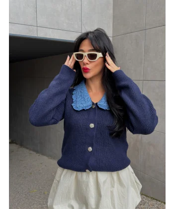 Yazı Şeritli Tek Düğmeli Crop Blazer Ceket Lacivert