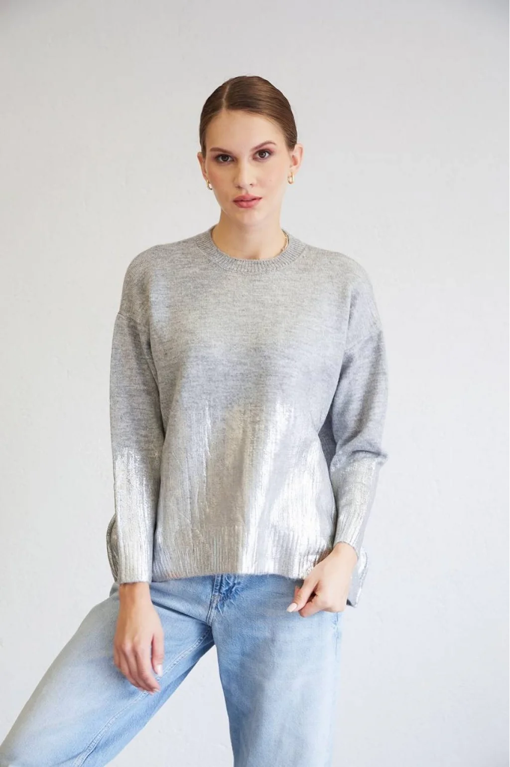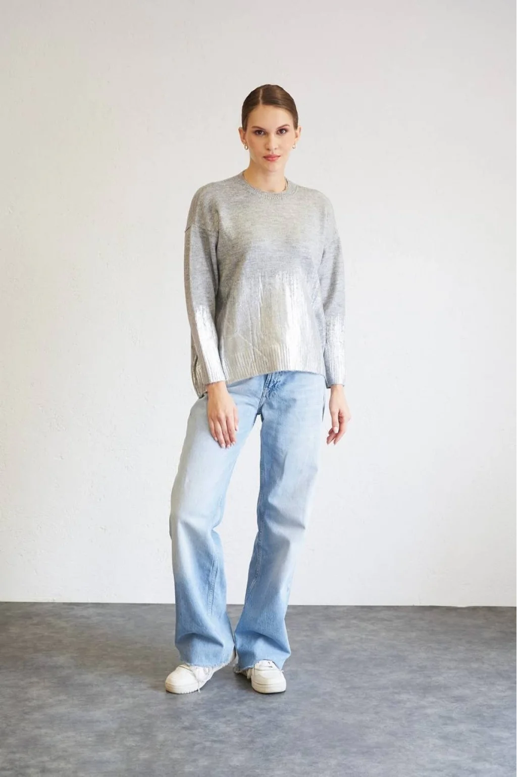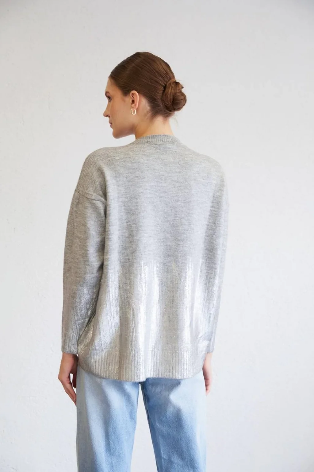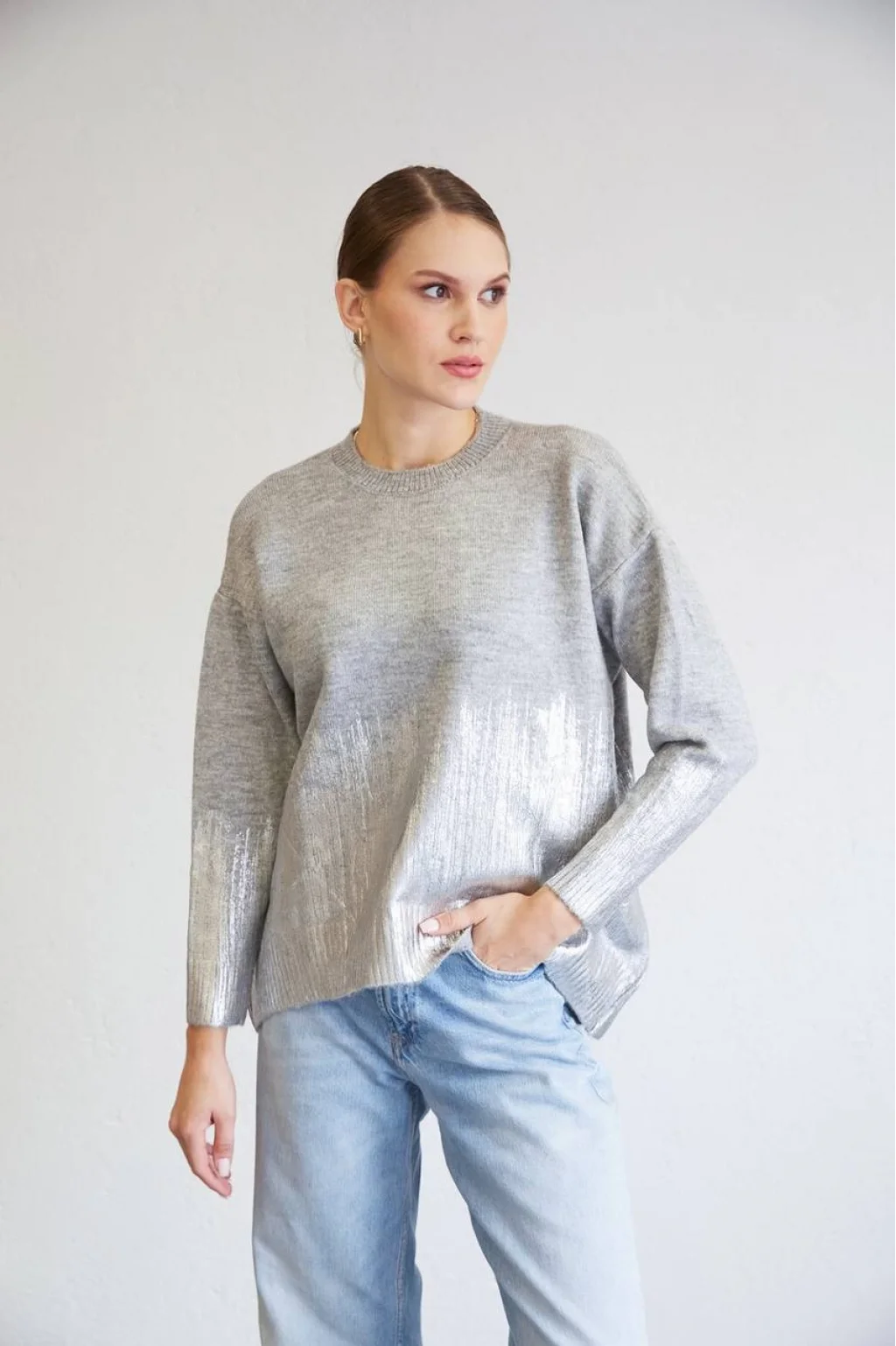 VARAK BASKILI TRİKO KAZAK ÇİFT RENK GÜMÜŞ GRİ
