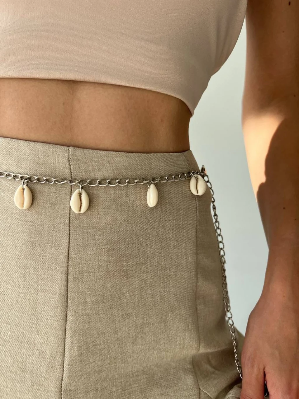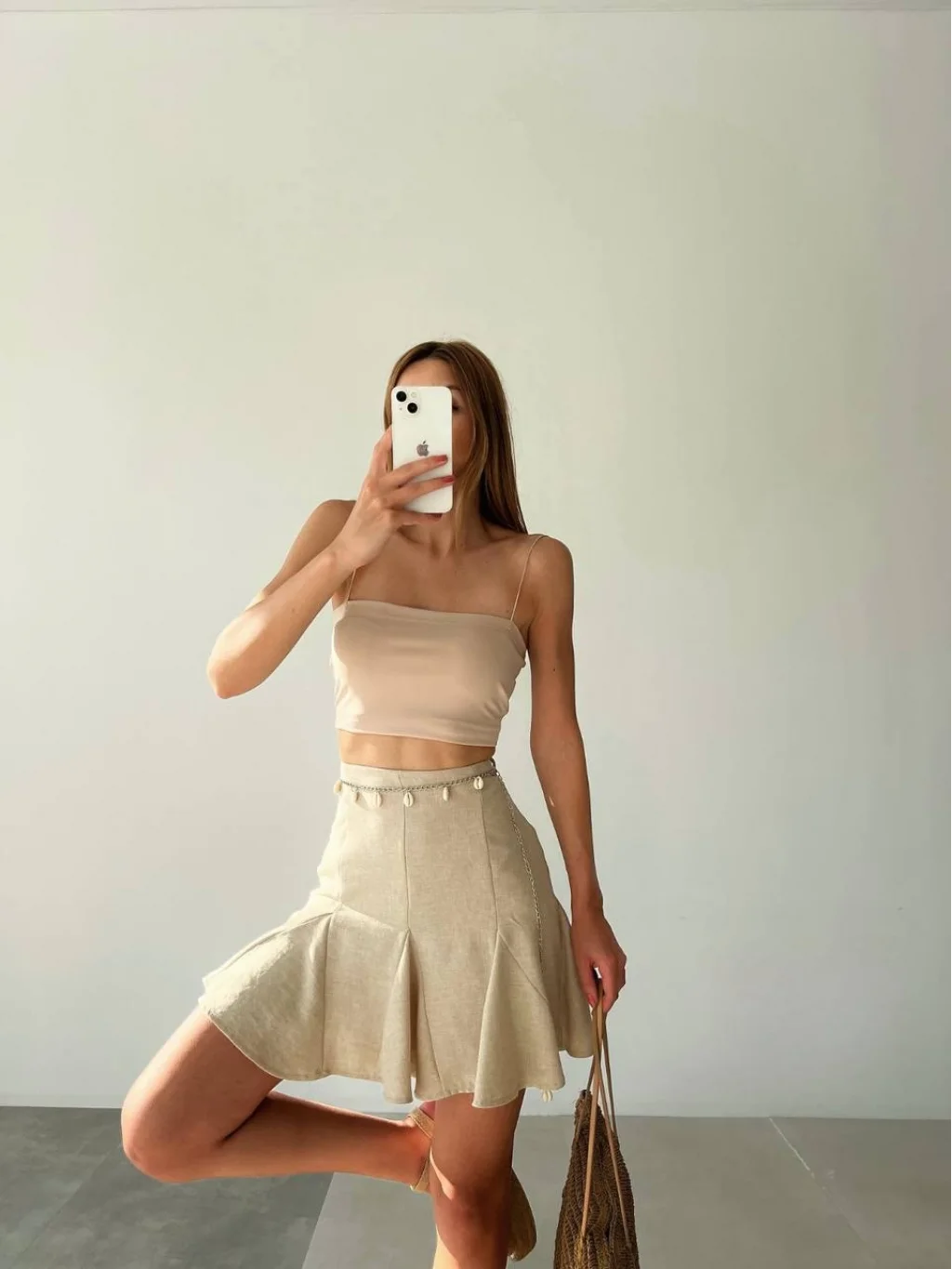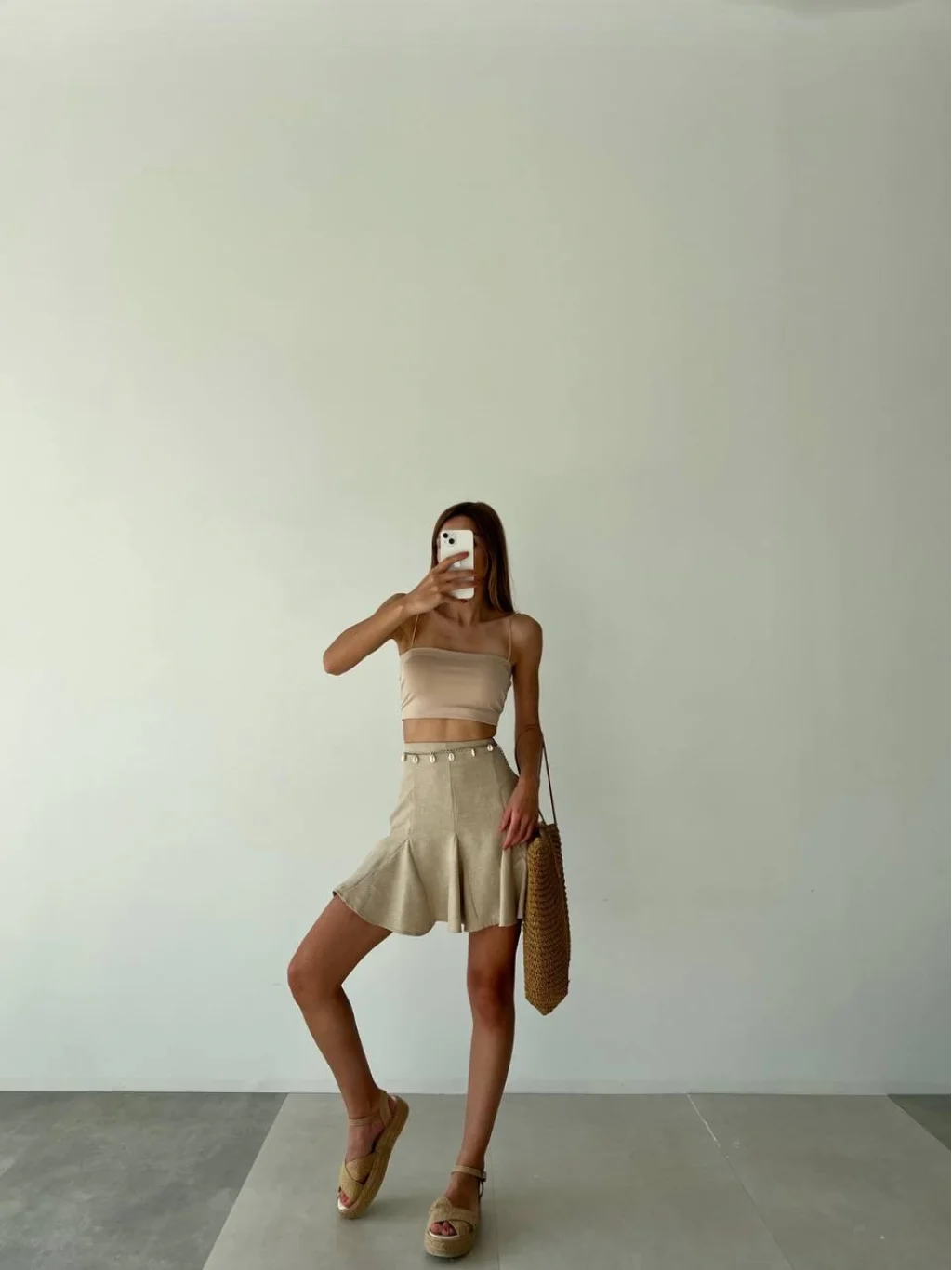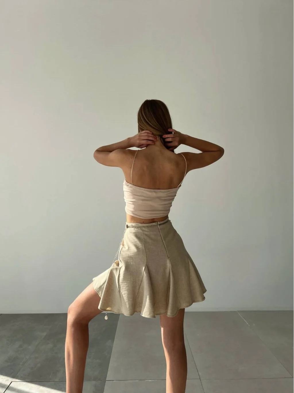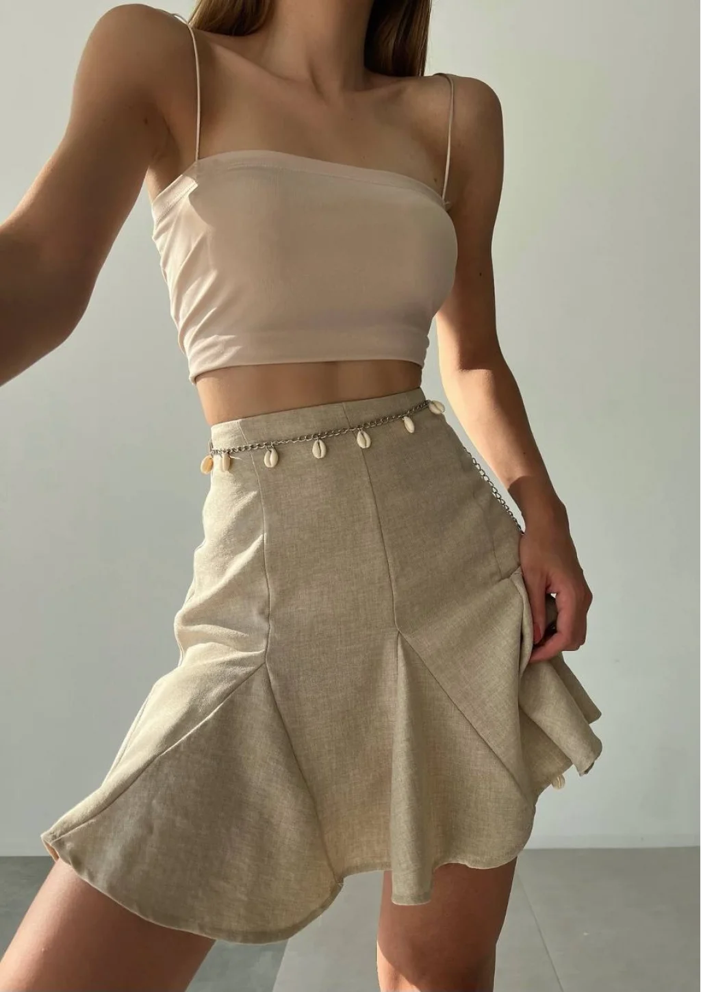 Ekru Volanlı Keten Zincir Detaylı Şort Etek