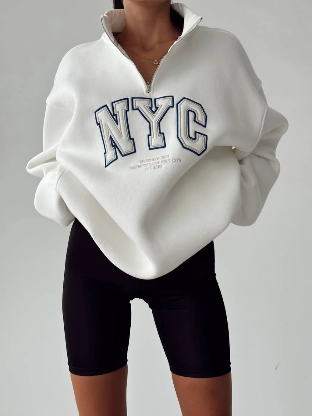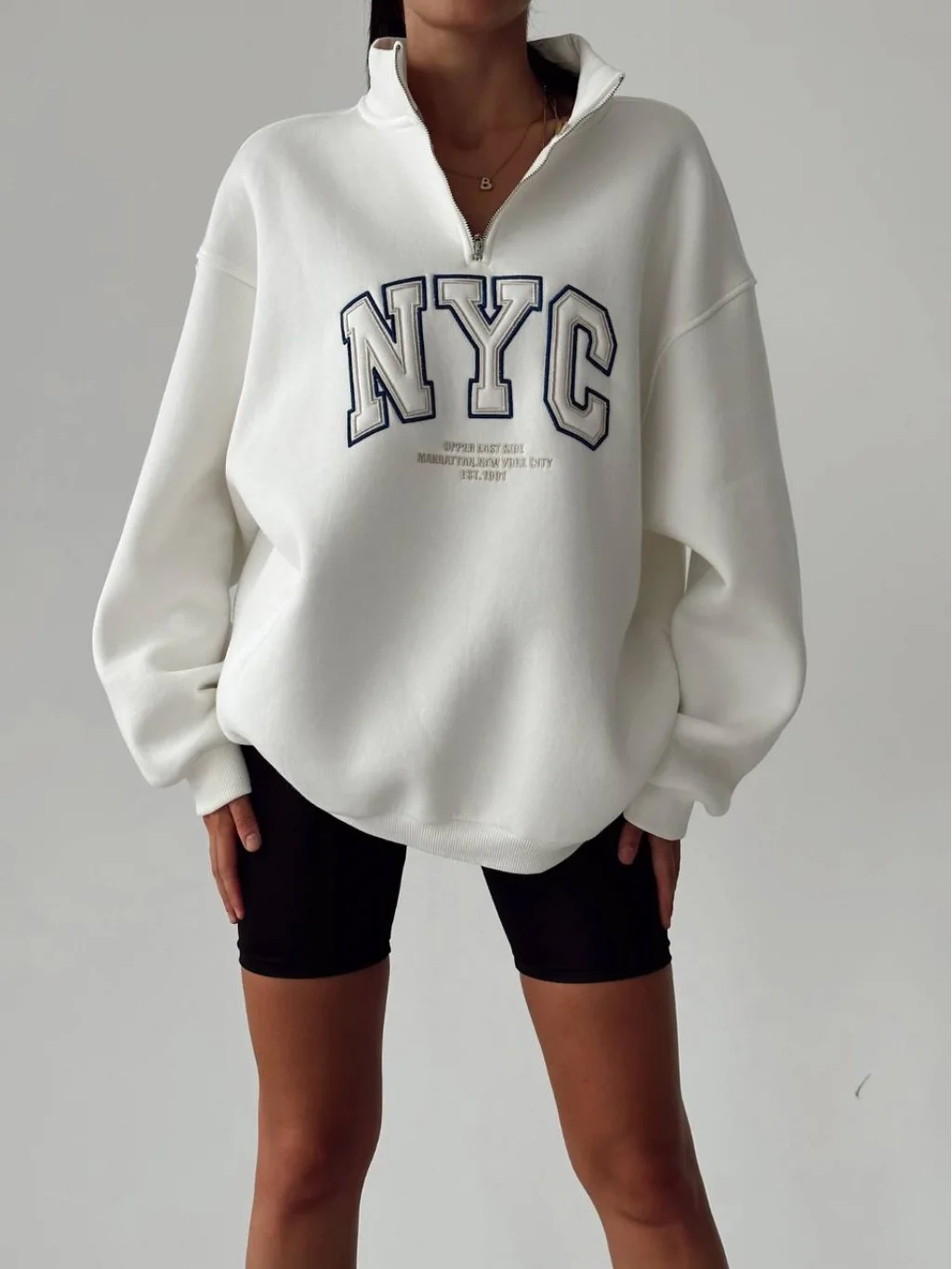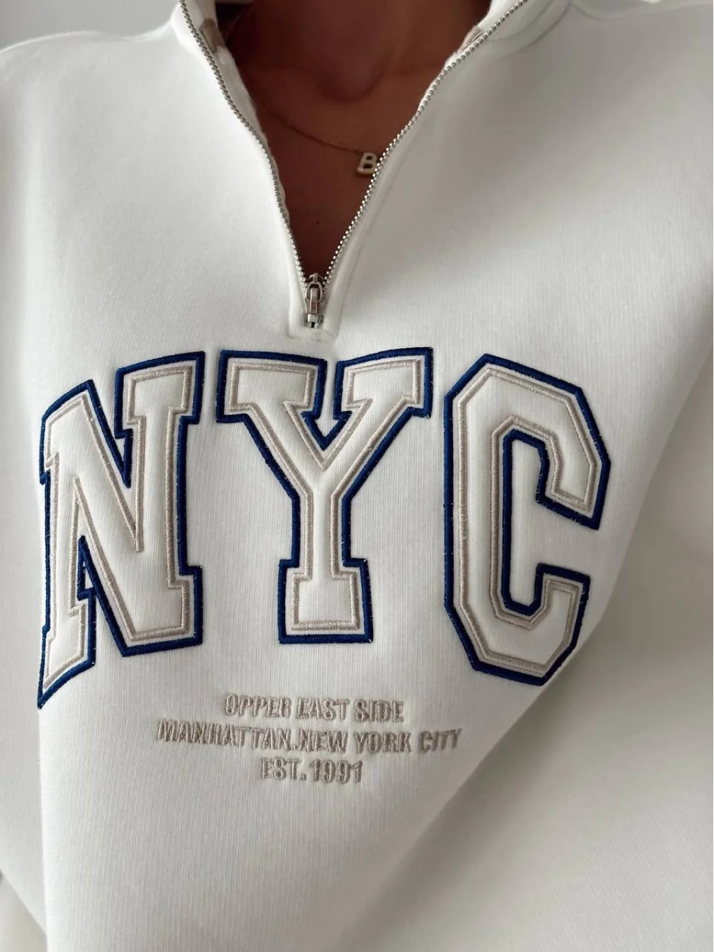 NYC Baskılı Fermuarlı Beyaz Sweatshirt