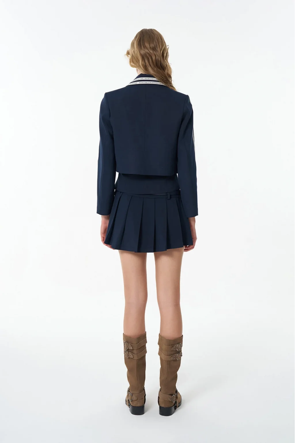 Yazı Şeritli Tek Düğmeli Crop Blazer Ceket Lacivert