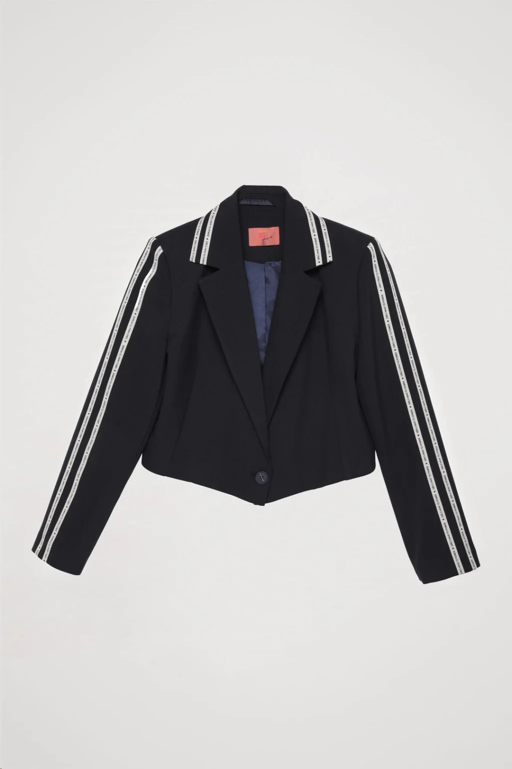 İçi astarlı, kolları ve yakası çift yazı şerit detaylı, kruvaze yaka, tek düğme kapamalı, uzun kollu, crop blazer ceket.