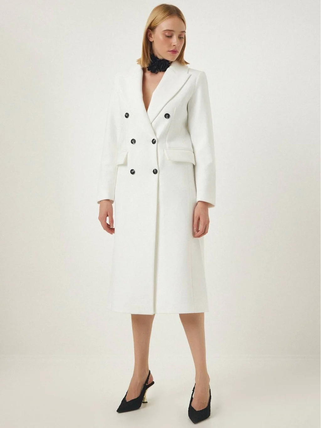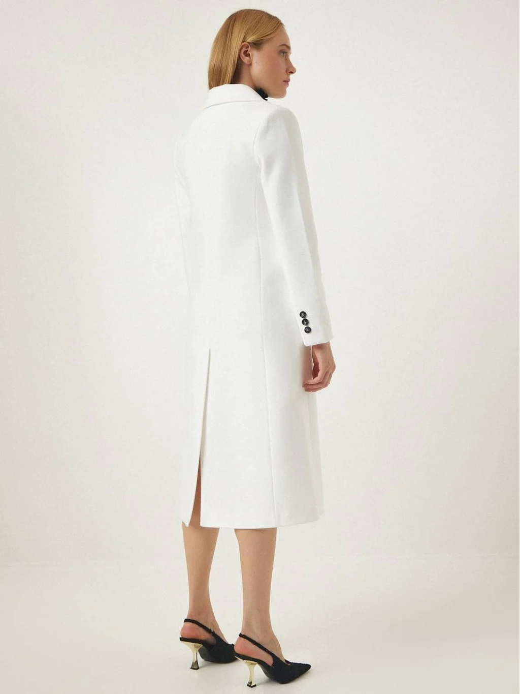 YIRTMAÇLI DÜĞMELİ BEYAZ YÜN KABAN
