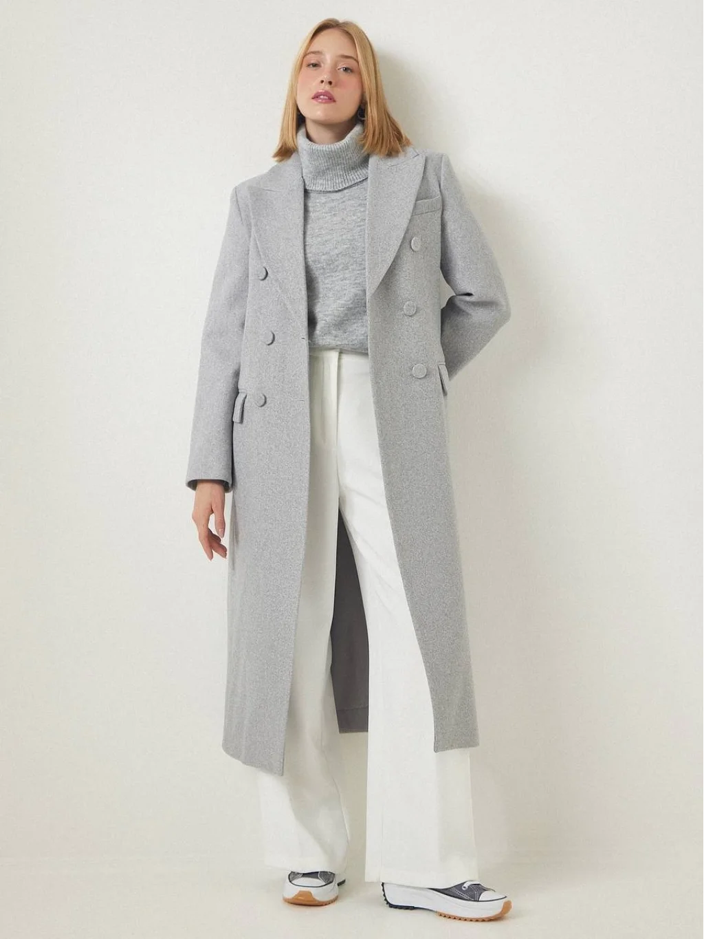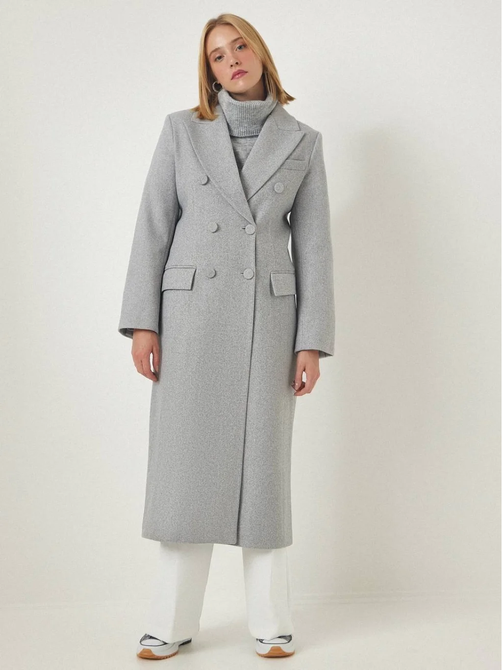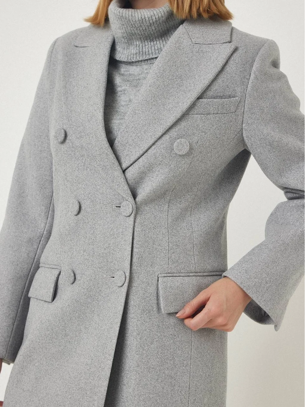 YIRTMAÇLI DÜĞMELİ GRİ YÜN KABAN