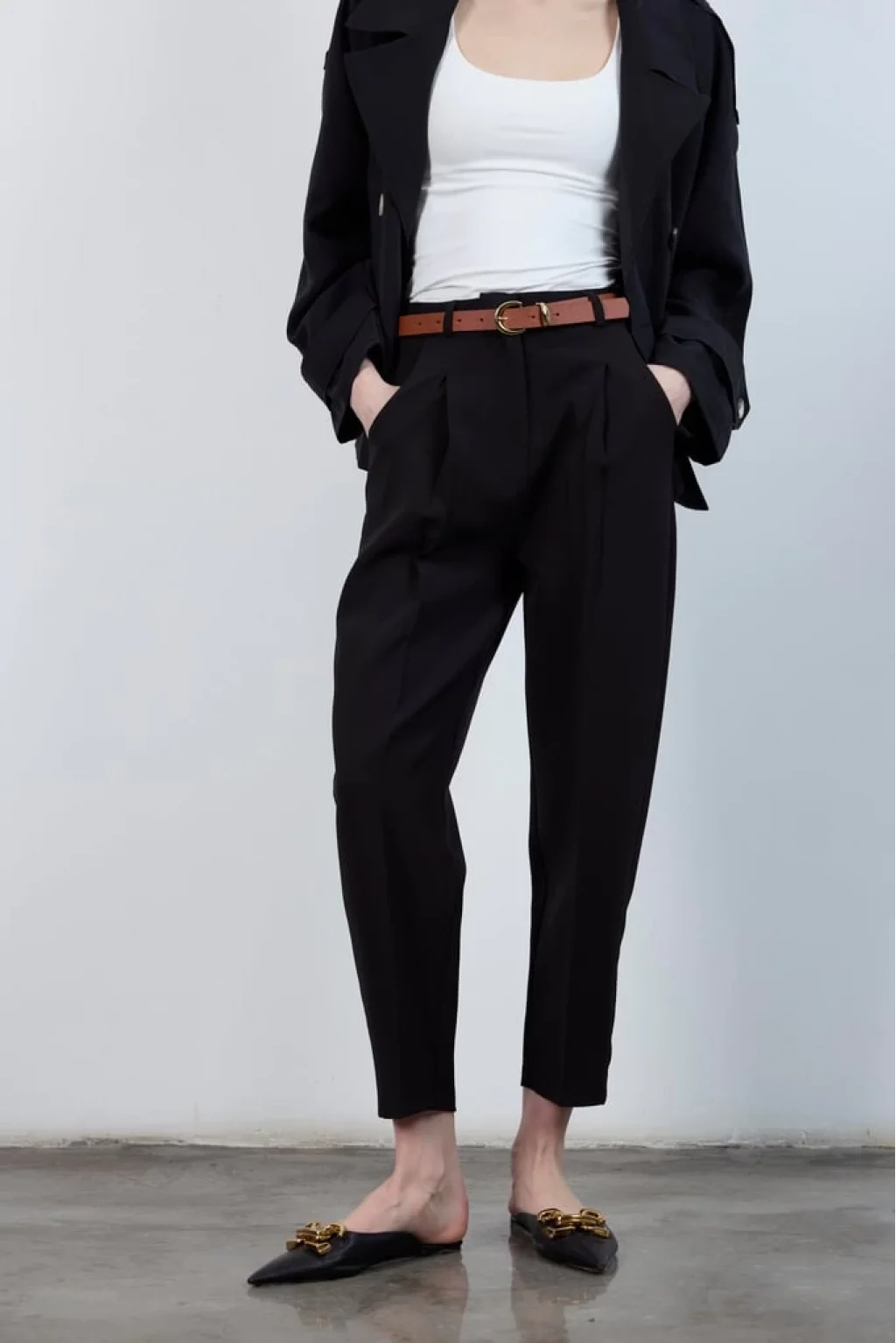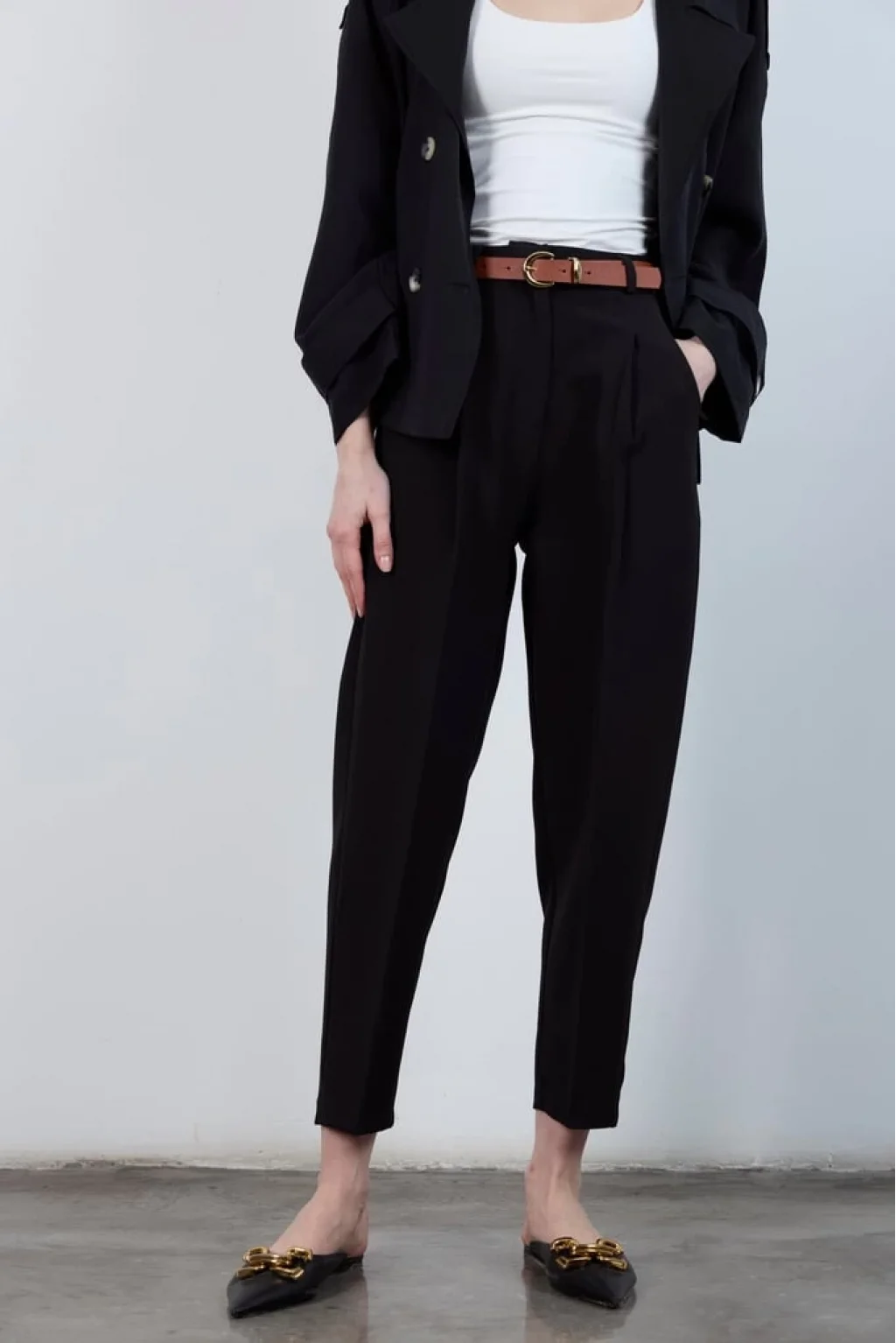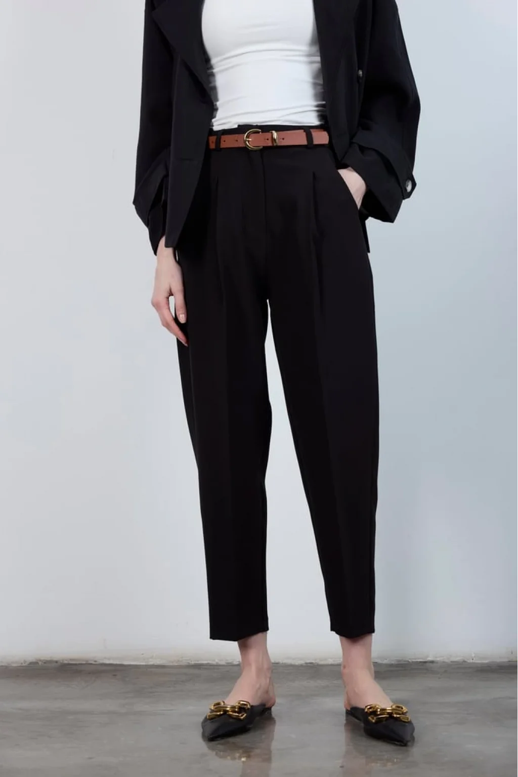 Kemer Detaylı Havuç Paça Yüksek Bel Siyah Pantolon