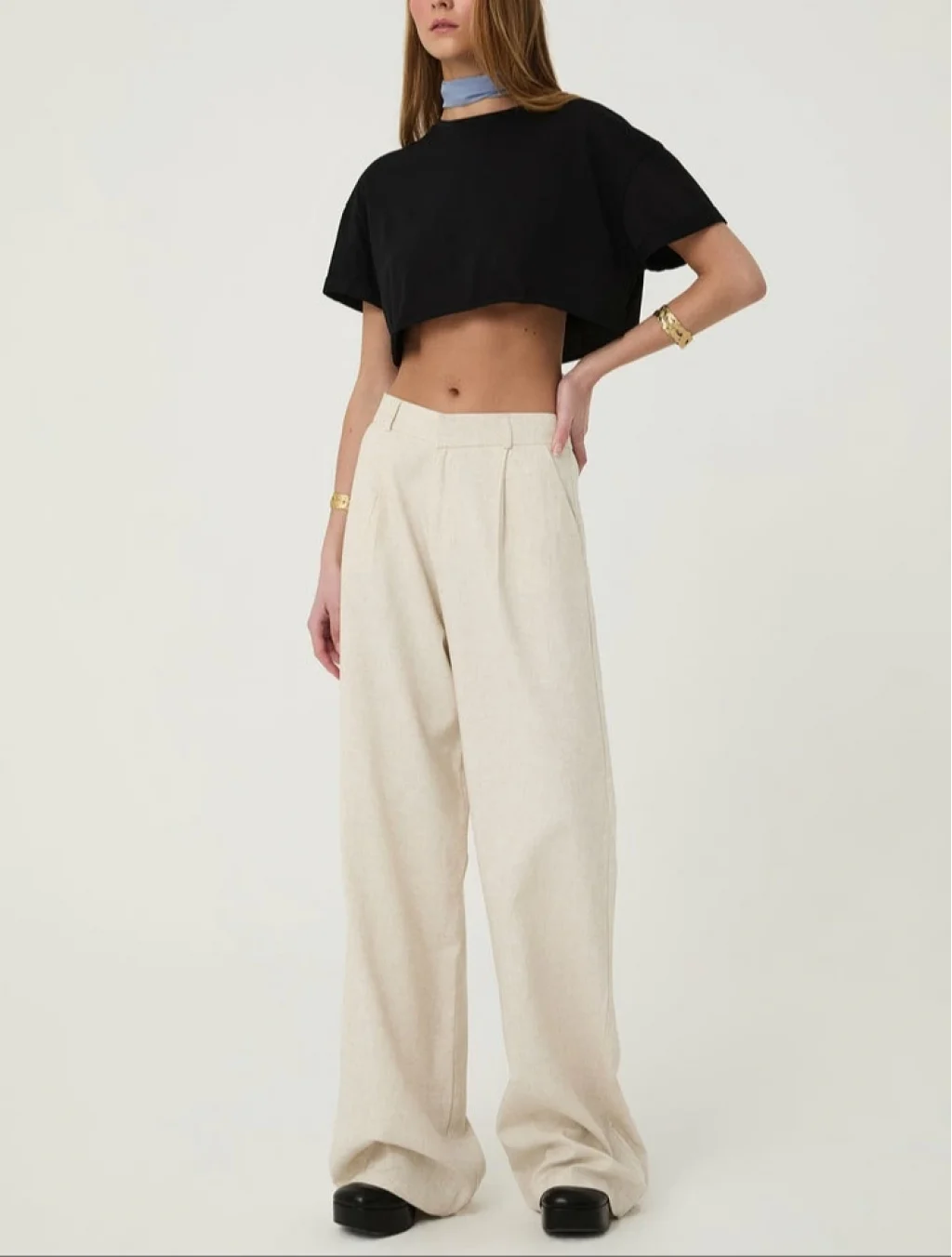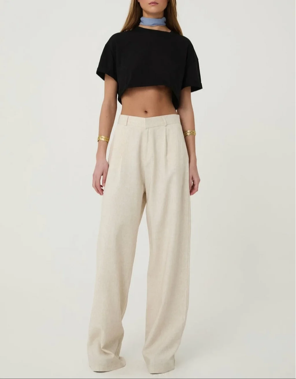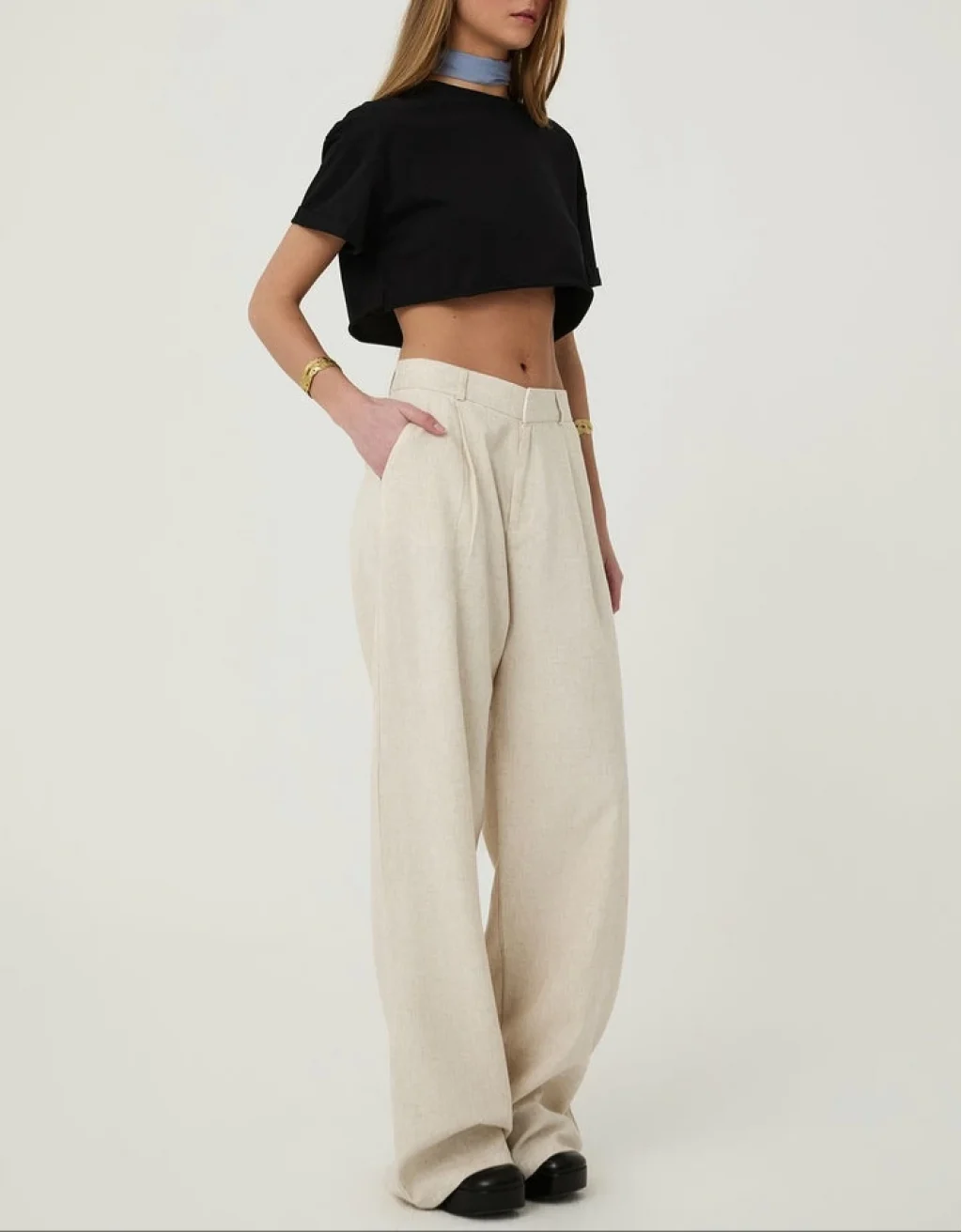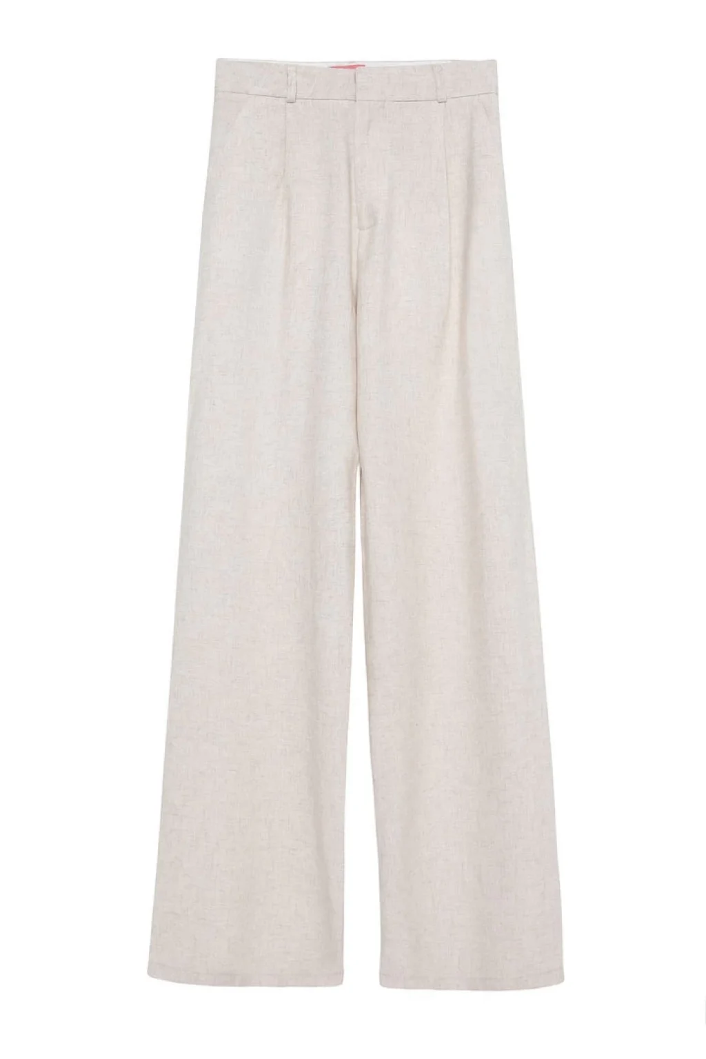 Keten karışımlı, yüksek bel, palazzo, gizli kopça düğmeli, çift cepli, uzun pantolon.