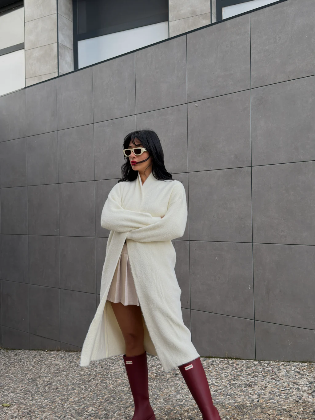 Yumoş Doku Uzun Hırka-Ekru, konforlu ve şık bir seçenek sunar.