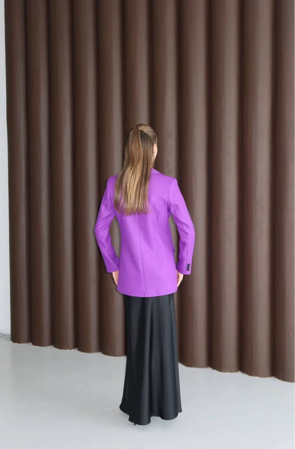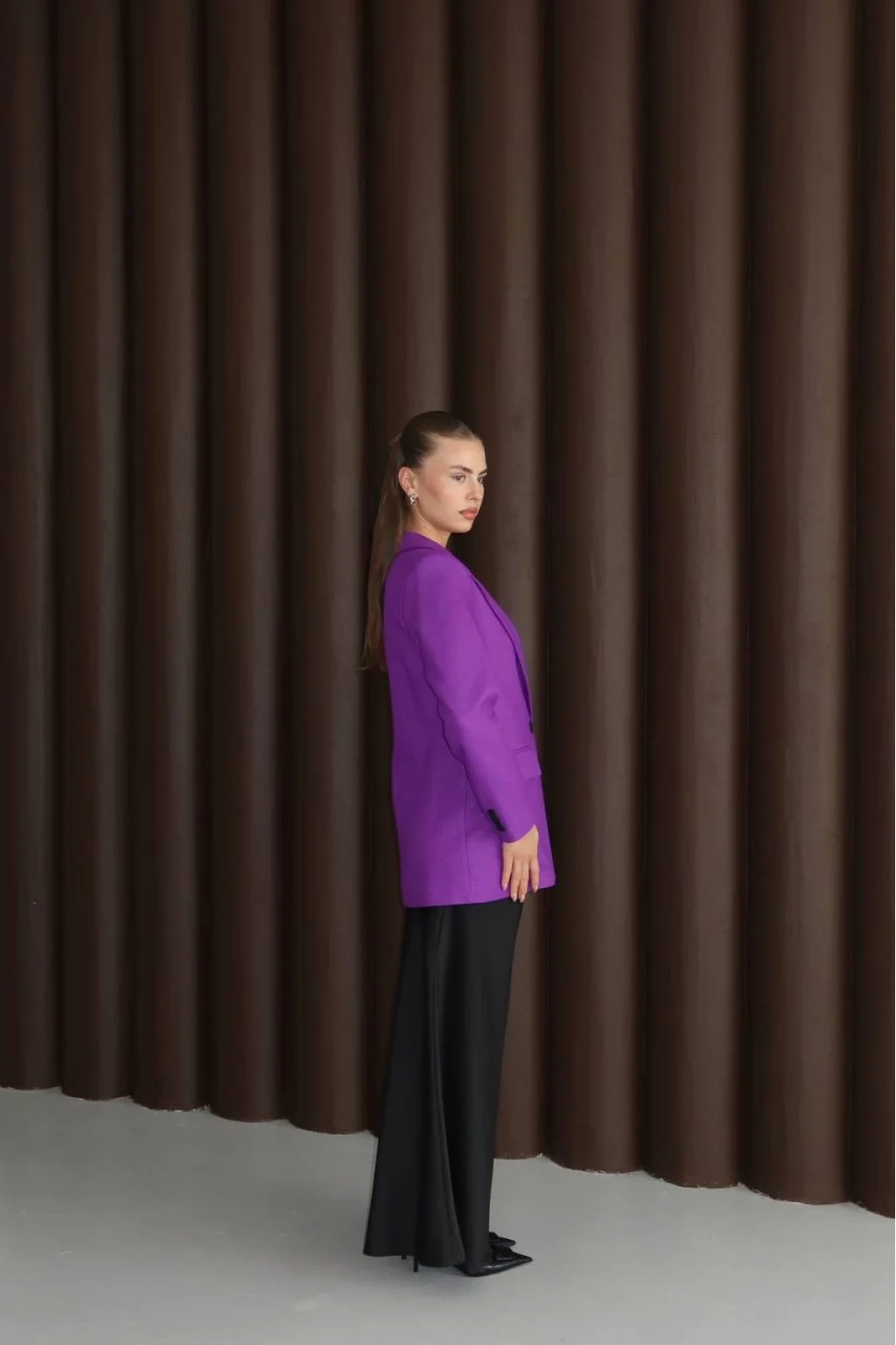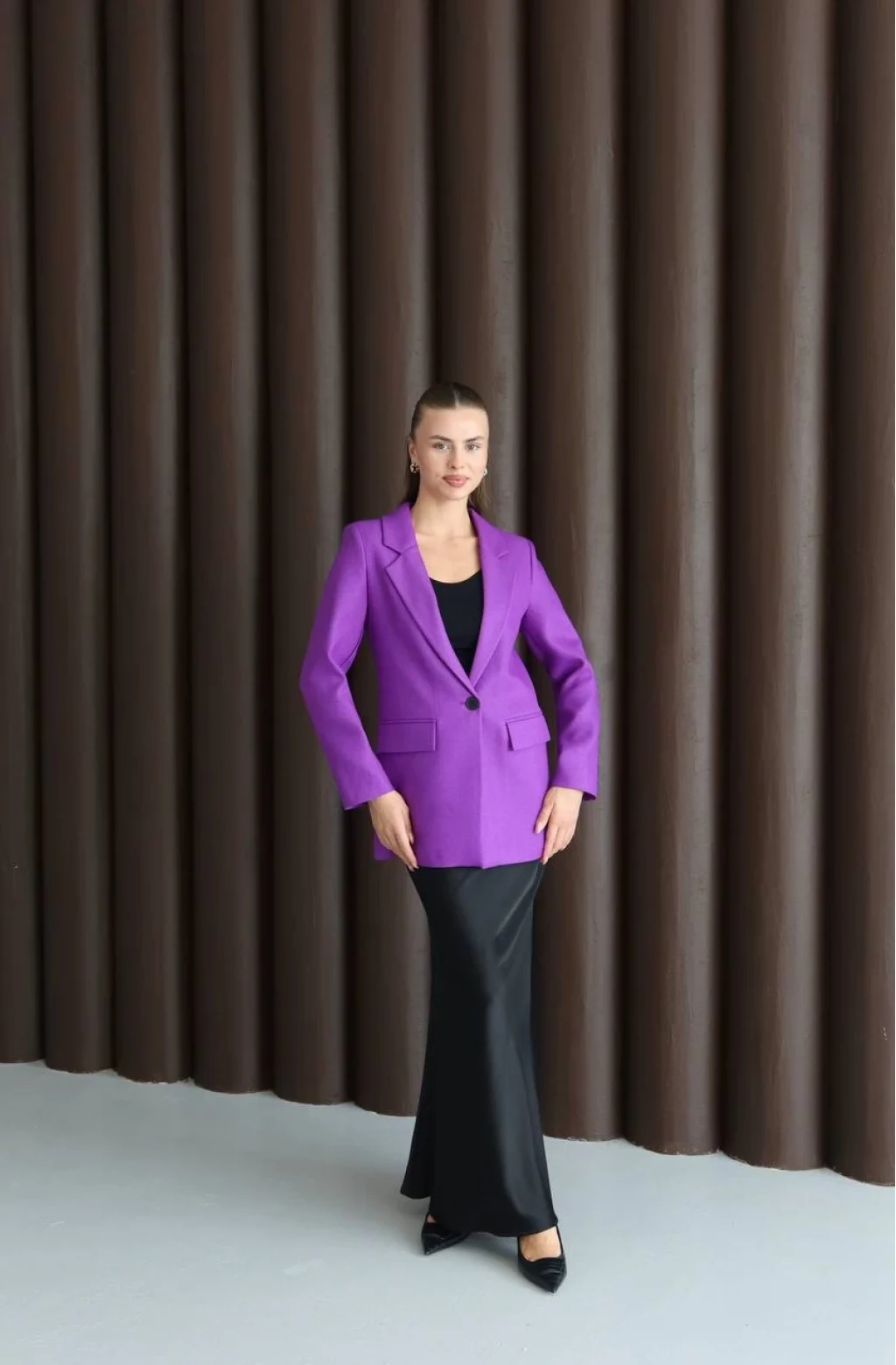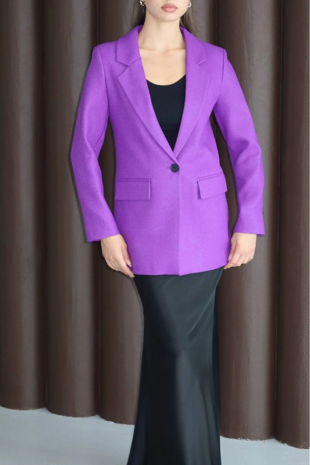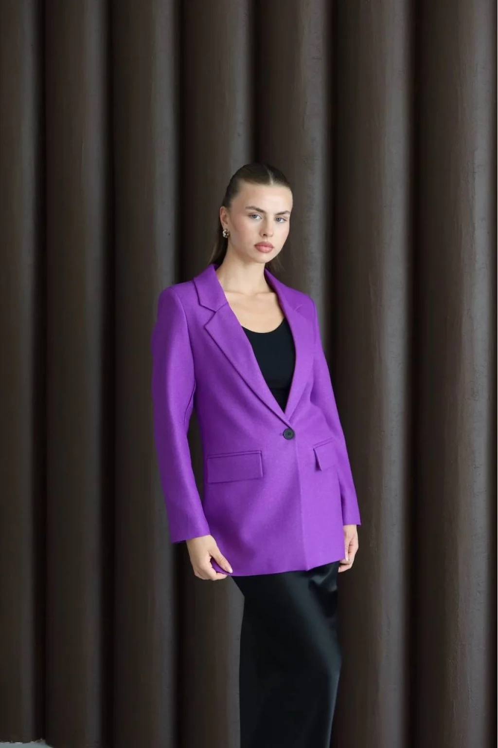 Ön tek düğme kapamalı,iç astarlı tam kalıp mor blazer ceket