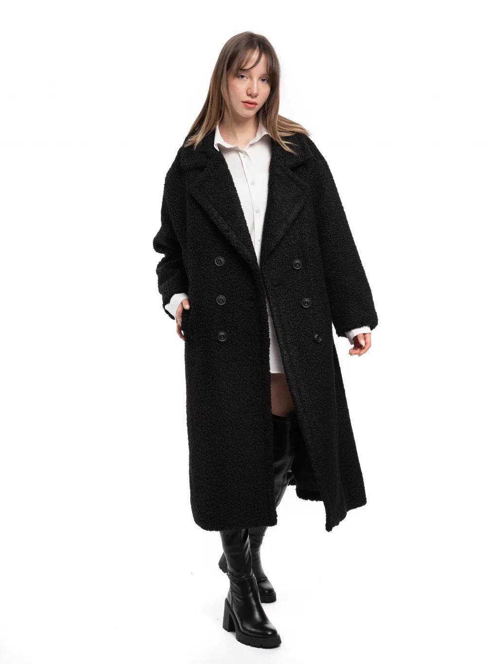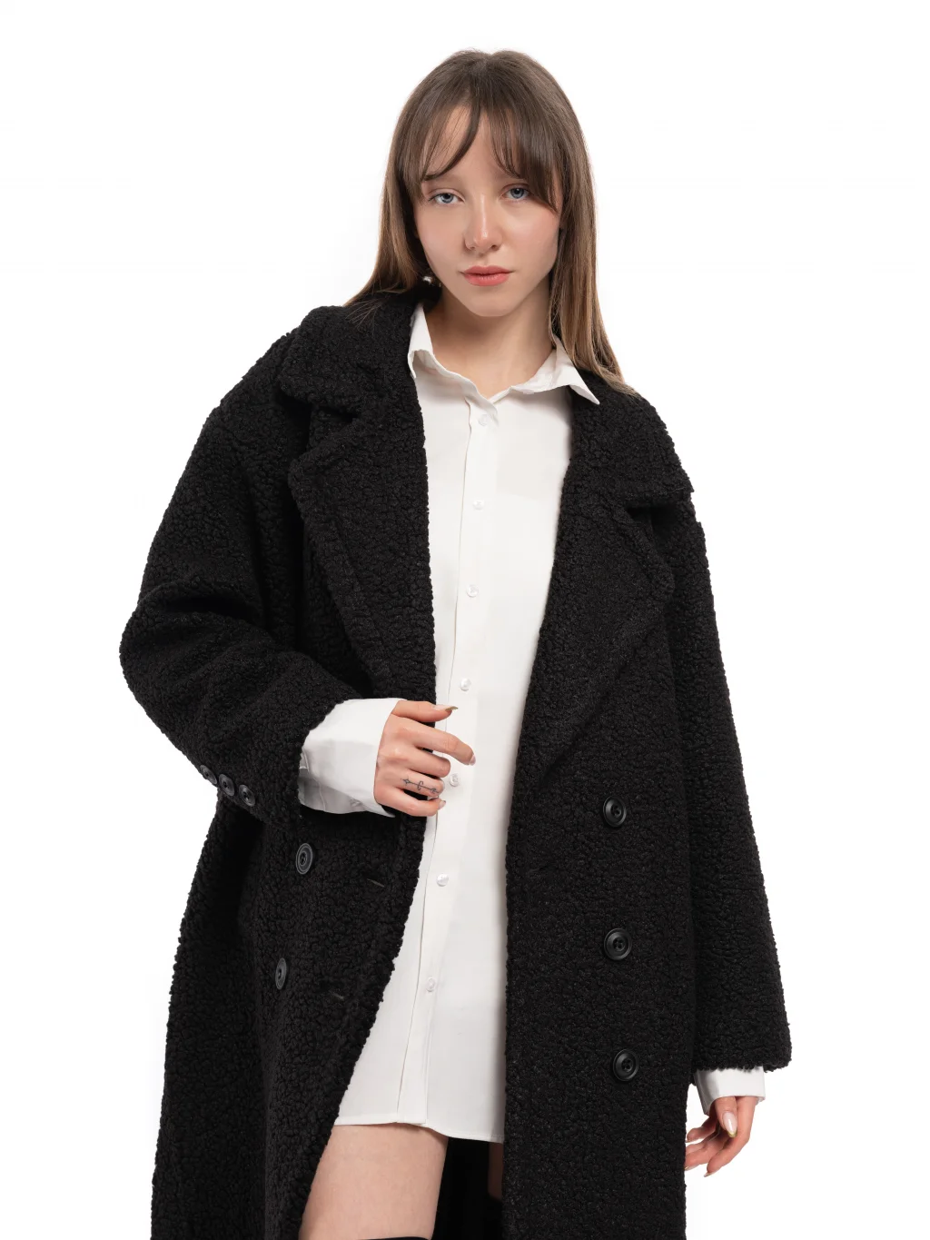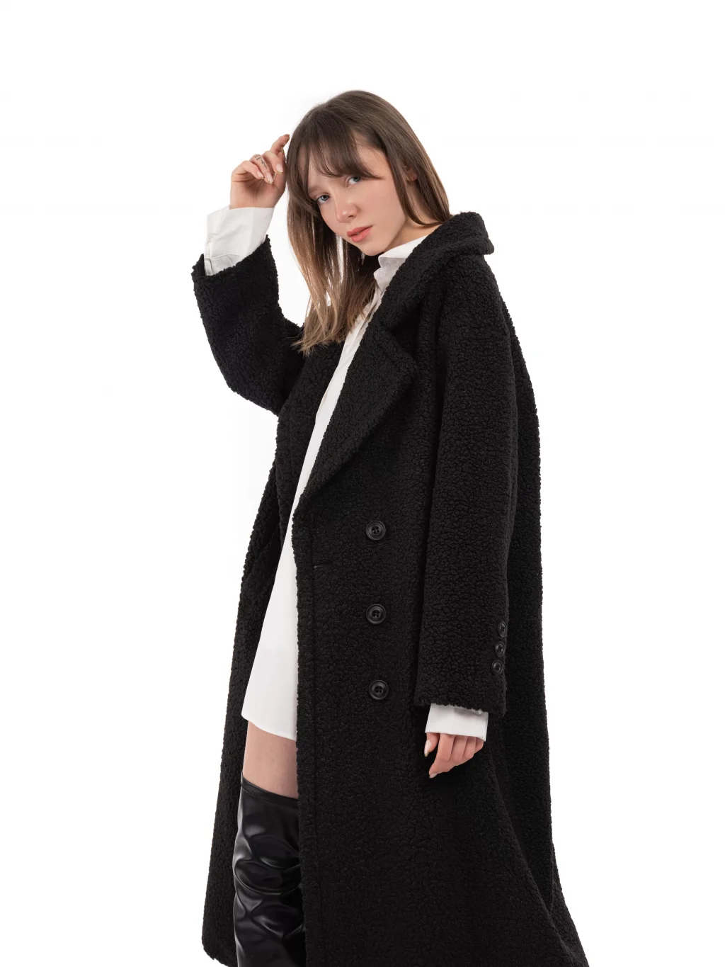 Yün Karışımlı Düğmeli Peluş Kaban Siyah