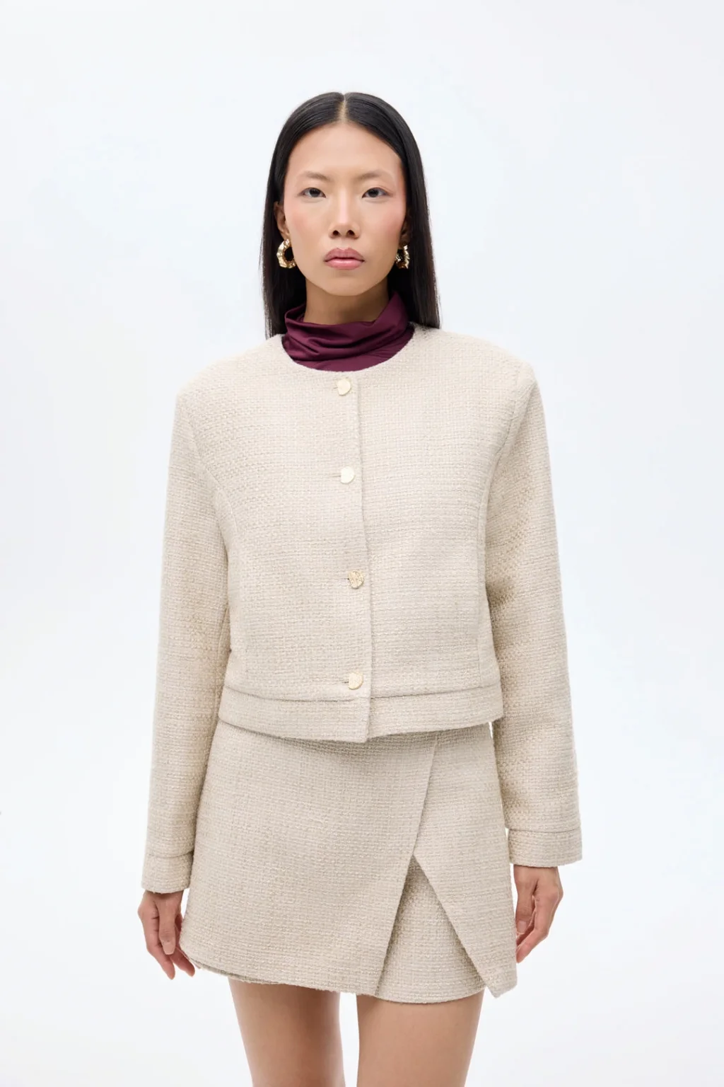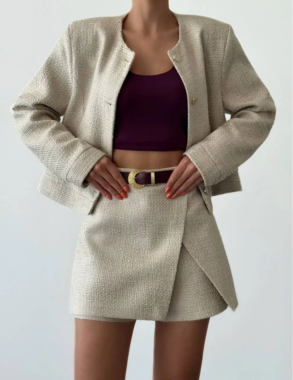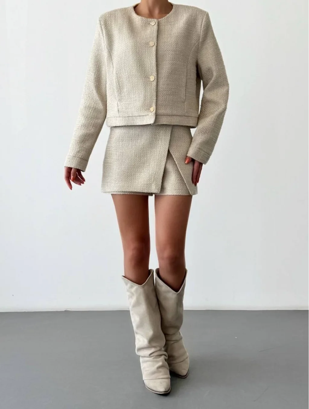 MYRA Yuvarlak Yaka Düğmeli Tüvit Ceket Bej, şıklığı ve tarzı bir arada sunar.